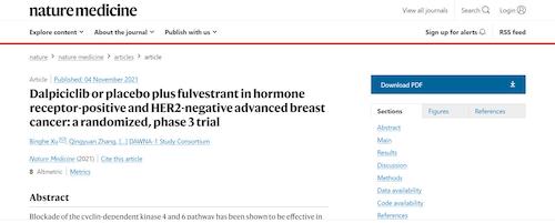 11月4日,国际四大医学期刊之一、英国《自然》旗下《自然医学》(Nature Medicine)在线发表CDK4/6抑制剂达尔西利(SHR6390)联合氟维司群治疗既往内分泌治疗后疾病进展的HR+/HER2-晚期乳腺癌的多中心、随机、双盲III期临床研究(DAWNA-1研究)中期分析结果报告,首次对氟维司群(雌激素受体降解剂)±达尔西利治疗激素受体阳性晚期乳腺癌的有效性和安全性进行了比较。研究结果显示,达尔西利+氟维司群组与安慰剂+氟维司群组相比,无进展生存期(PFS)显著延长。该项研究由中国医学科学院肿瘤医院徐兵河教授担任leading PI,全国39家医院参研,由bb贝博Ballbet临床研发团队支持完成。