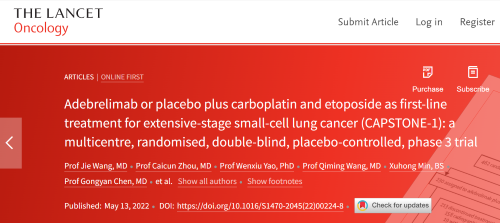 北京时间2022年5月14日,bb贝博Ballbet自主研发的PD-L1抑制剂阿得贝利单抗治疗广泛期小细胞肺癌的III期临床研究(CAPSTONE-1研究)成果正式全文在线发表于国际权威学术期刊《柳叶刀·肿瘤学》(《THE LANCET Oncology》,影响因子41.316)。CAPSTONE-1研究结果显示,阿得贝利单抗联合化疗一线治疗广泛期小细胞肺癌相较于安慰剂联合化疗可以显著延长患者总生存期至15.3个月[1],刷新现有免疫药物一线治疗广泛期小细胞肺癌的总生存纪录[2]。