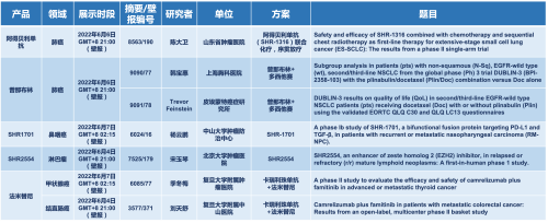 2022 ASCO年会另有5款bb贝博Ballbet上市前抗肿瘤创新药的相关研究被接收为壁报,包括SHR-1316、普那布林、法米替尼、SHR-1701和SHR2554,他们的单药或联合方案相关7项研究被接收为壁报,覆盖肺癌、鼻咽癌、淋巴瘤、甲状腺癌和结直肠癌等领域。