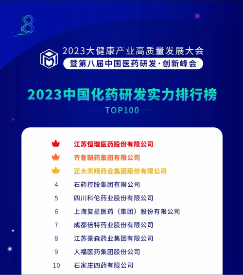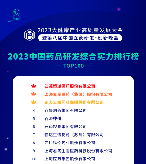 由药智网、中国药业杂志社主办的2023大健康产业高质量发展大会暨第八届中国医药研发•创新峰会于6月16日开幕,会上发布了《2023中国药品研发实力排行榜》系列榜单,bb贝博Ballbet凭借深厚的创新研发实力再创辉煌:荣登《2023中国药品研发综合实力排行榜TOP100》榜首、《2023中国化药研发实力排行榜TOP100》榜首。值得一提的是,今年是bb贝博Ballbet连续第6年入选《中国药品研发综合实力排行榜》榜首。