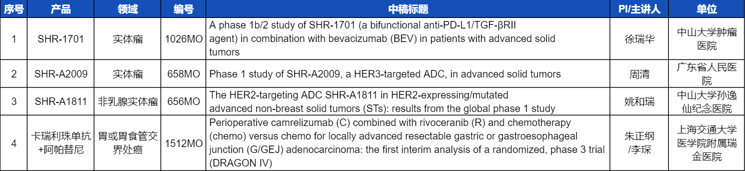 本次ESMO大会,将由中山大学肿瘤医院徐瑞华教授、广东省人民医院周清教授、中山大学孙逸仙纪念医院姚和瑞教授、上海交通大学医学院附属瑞金医院李琛教授分别就4项bb贝博Ballbet创新产品相关研究做口头报告,包括SHR-1701、SHR-A2009、SHR-A1811这3款未上市创新产品的实体瘤治疗临床研究,以及1项“双艾”组合(卡瑞利珠单抗联合阿帕替尼)治疗局部晚期可切除胃/胃食管交界处癌的Ⅲ期临床试验期中分析。