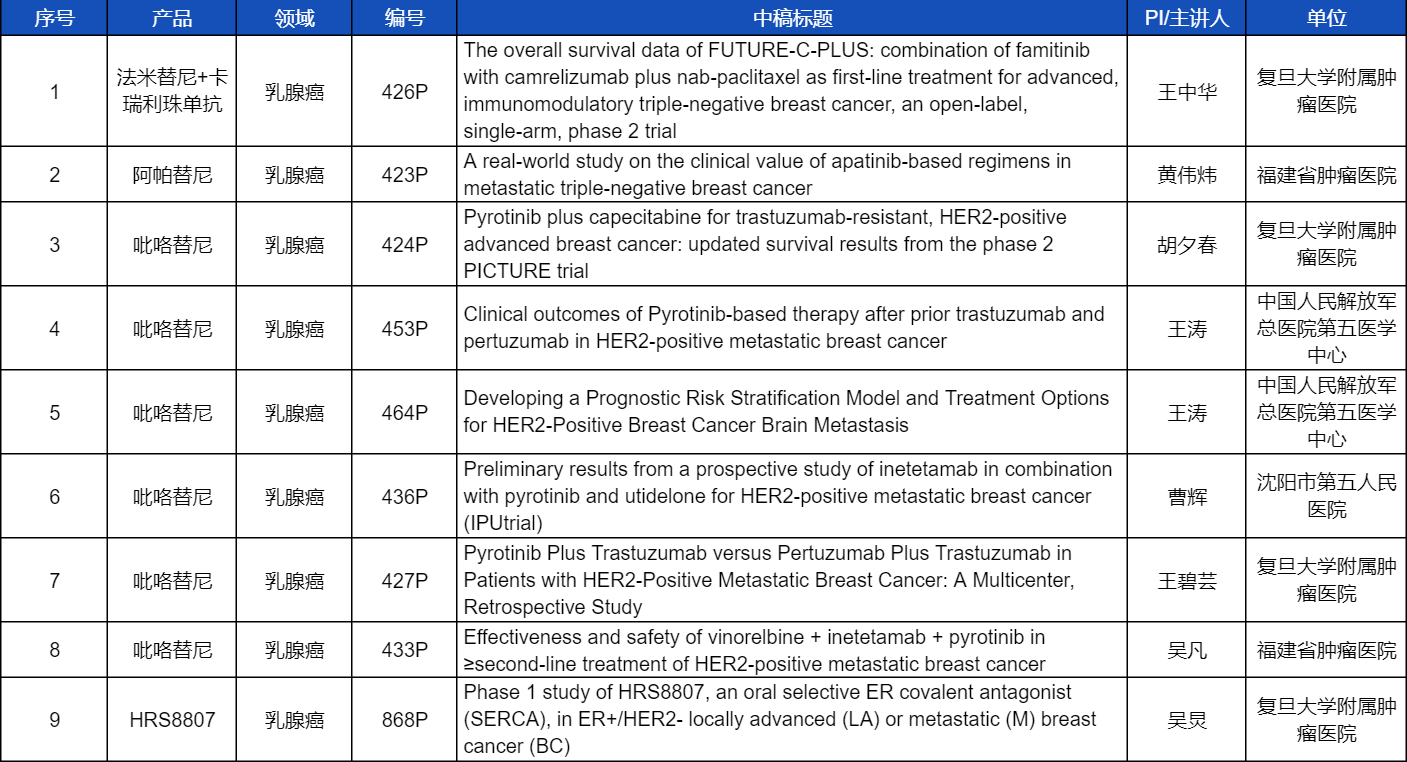 在乳腺癌领域,吡咯替尼、阿帕替尼、卡瑞利珠单抗、法米替尼,或产品间联合或联合化疗,共有9项研究入选壁报讨论,其中吡咯替尼占据6项,较为全面地展示了这款中国首个自主研发抗HER2靶向药在乳腺癌治疗中的显著特点和潜力。此外,bb贝博Ballbet自主研发的新型选择性雌激素受体共价拮抗剂(SERCA)HRS8807治疗ER+/HER2-局部晚期或转移性乳腺癌的Ⅰ期研究也成功入选,有望为此类患者带来更多用药新选择。