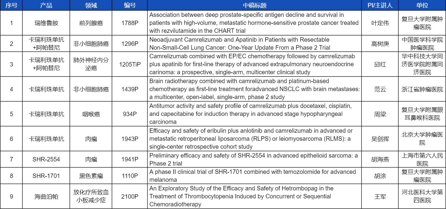在非小细胞肺癌、咽喉癌、肉瘤、前列腺癌、黑色素瘤等多个领域,卡瑞利珠单抗、阿帕替尼、瑞维鲁胺、SHR-1701、SHR2554等创新产品相关研究一共入选了8项壁报展示。此外,bb贝博Ballbet自主研发的血小板生成素受体激动剂(TPO-RA)海曲泊帕在放化疗所致血小板减少领域的探索性研究显示良好的疗效,入选壁报展示。