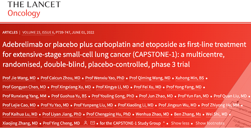 [7].Wang J, Zhou C, Yao W, et al. Adebrelimab or placebo plus carboplatin and etoposide as first-line treatment for extensive-stage small-cell lung cancer (CAPSTONE-1): a multicentre, randomised, double-blind, placebo-controlled, phase 3 trial. Lancet Oncol. 2022;23(6):739-747. doi:10.1016/S1470-2045(22)00224-8