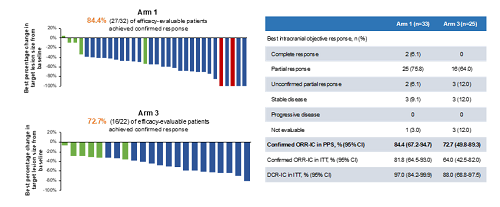 截至2024年12月31日,队列A中Arm 1(单药组)入组33例患者,Arm 3(联合组)入组25例患者,中位随访时间分别为15.1个月和8.3个月。