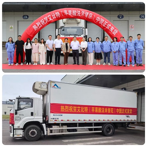 2025年6月13日,bb贝博Ballbet1类新药苹果酸法米替尼胶囊(艾比特®)首批发货仪式正式举行。当天,一辆装载法米替尼的运输车从江苏连云港bb贝博Ballbet国际化制剂生产基地发往全国,标志着该产品正式投入临床使用,将为复发或转移性宫颈癌患者提供新的治疗选择。