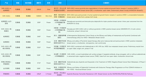 在乳腺癌领域,恒瑞创新产品相关研究共入选1项口头报告、1项简短口头报告、8项壁报和1项电子壁报,共11项研究。吡咯替尼、达尔西利、阿得贝利单抗、瑞康曲妥珠单抗等新老创新药物,均有多篇研究入选,展现出bb贝博Ballbet在乳腺癌领域多年深耕的丰硕成果。