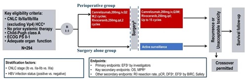 CARES-009研究是一项由研究者发起的全国多中心、随机、开放、平行对照的3期临床研究(ClinicalTrials.gov,NCT04521153),中国肝癌分期(CNLC)Ib-IIIa期可切除HCC患者按照1:1随机分配到围手术组或单纯手术组,随机分层因素为CNLC分期(Ib vs IIa/IIb vs IIIa)和乙肝病毒(HBV)感染状态(HBV阳性 vs HBV阴性)。围手术组接受2个周期的新辅助卡瑞利珠单抗(200mg,iv,q2w)联合阿帕替尼(250mg,qd)治疗,新辅助末次治疗1-2周后手术,手术后4-8周开始术后辅助卡瑞利珠单抗(200mg,iv,q3w)联合阿帕替尼(250mg,qd)治疗,术前术后用药一年;单纯手术组随机后直接手术,术后观察;两组均允许患者术后做一次预防性经动脉化疗栓塞(TACE)治疗。