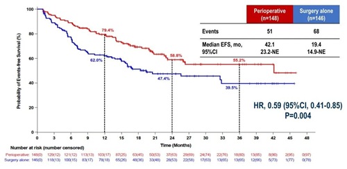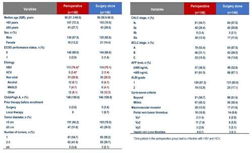 自2021年3月25日至2024年1月29日,共随机294例受试者,围手术组148例,单纯手术组146例。围手术组和单纯手术组的基线人口统计学和临床特征均平衡,两组的中位年龄分别为58和59岁;大部分患者为男性(88% vs 86%),ECOG 0分(98% vs 99%),HBV感染(76% vs 78%),肿瘤最大直径>5cm(68% vs 71%),单病灶(55% vs 58%)。两组不同CNCL分期、巴塞罗那分期(BCLC)的患者人数相当,CNCL Ib期为55% vs 58%,CNCL IIa期28% vs 29%,CNCL IIb期3% vs 2%,CNCL IIIa期为14% vs 12%;BCLC A期为53% vs 58%,BCLC B期为31% vs 29%,BCLC C期为16% vs 13%。