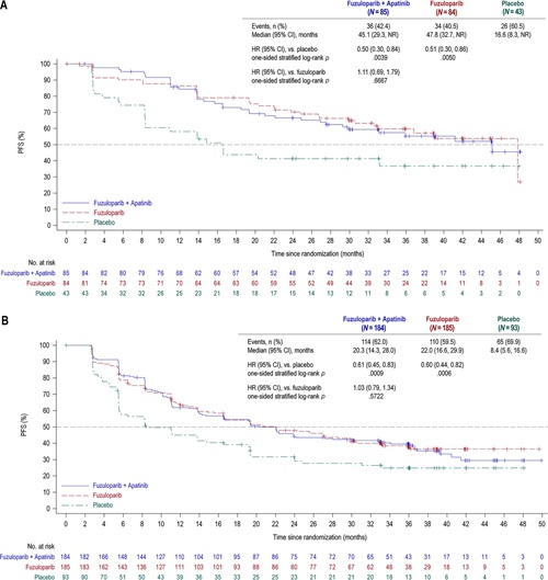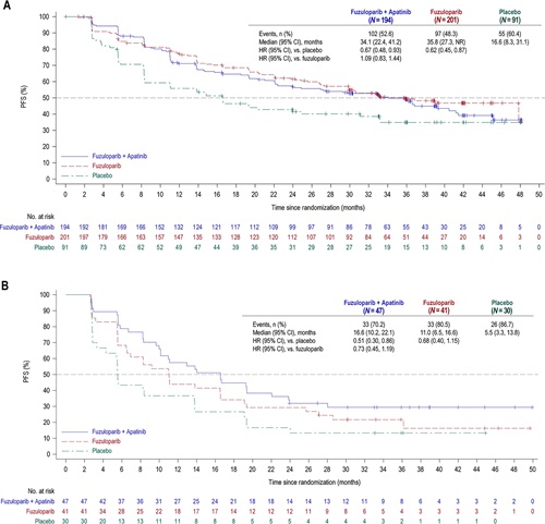FZPL组的中位治疗持续时间为23.9个月(范围:0.1~49.7个月),安慰剂组为14.6个月(范围:0.03~39.6个月)。联合治疗组中,氟唑帕利的中位治疗持续时间为23.7个月(范围:0.2~50.0个月),阿帕替尼的中位治疗持续时间为18.3个月(范围:0.2~50.0个月)。